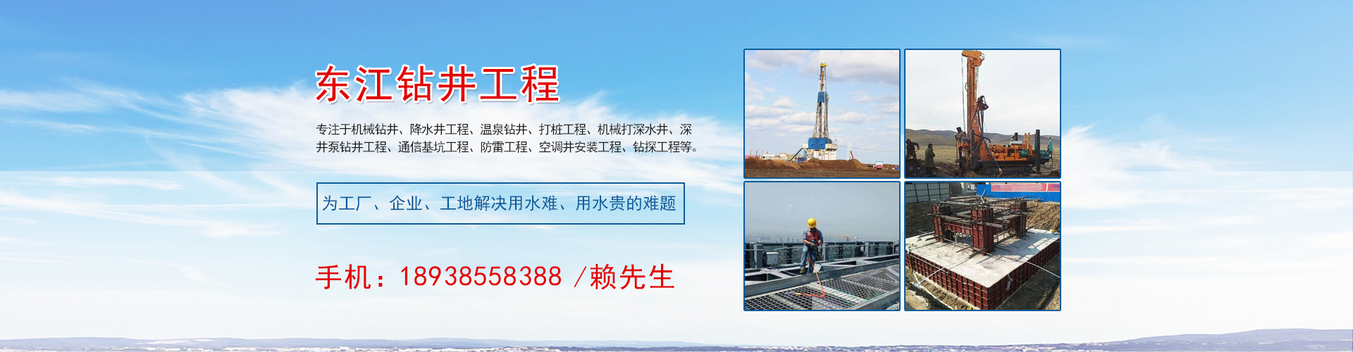 東莞市東江鉆井工程有限公司專注于機(jī)械鉆井、降水井工程、溫泉鉆井、打樁工程、機(jī)械打深水井、深井泵鉆井工程、通信基坑工程、防雷工程、空調(diào)井安裝工程、鉆探工程等。